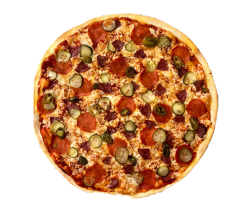 тесто, соус кимчи, сыр, пепперони,салями, корнишоны,перец халапенью орегано (36 см)