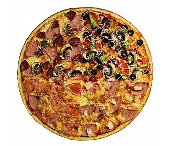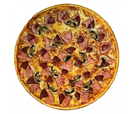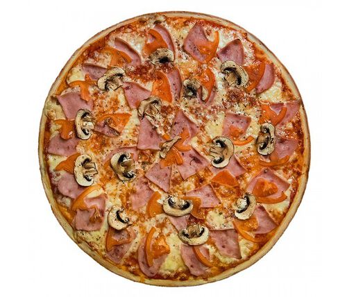 Томатный соус, сыр, колбаски "Пепперони", ветчина, шампиньоны, перец болгарский, помидоры, специи