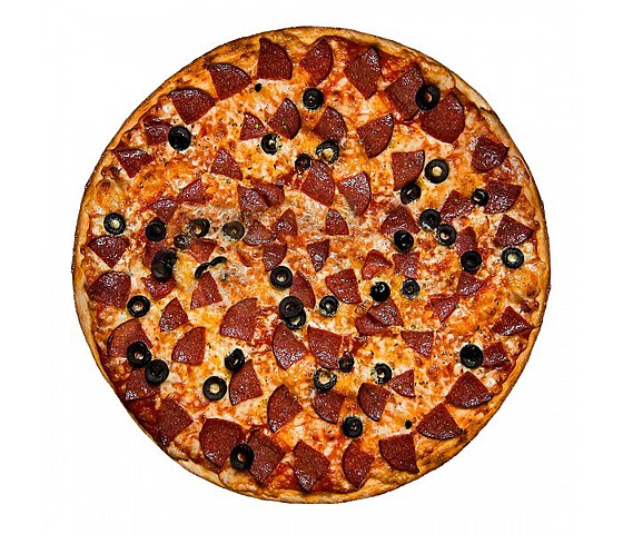 Томатный соус, сыр, колбаски "Пепперони", бекон, шампиньоны, маслины, специи